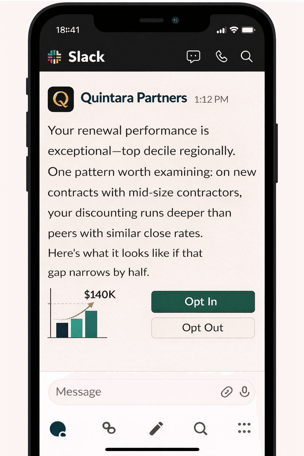 James has spent twelve years in industrial distribution sales. He knows his accounts. He makes his numbers. But there's a pattern in his work he's never seen: on a specific deal type with a specific customer profile, his discount-to-close runs deeper than peers with comparable win rates. The gap costs $140,000 a year in margin he could have kept.